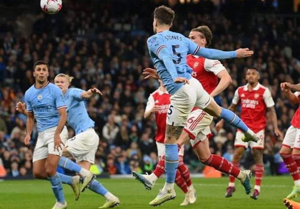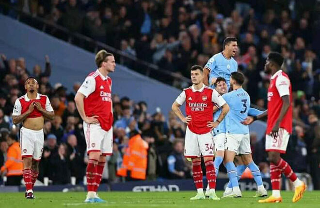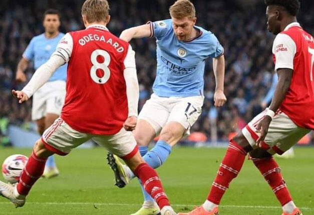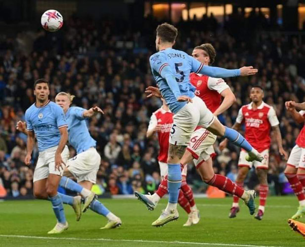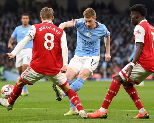 تابع مانشستر سيتي هوايته بهزيمة آرسنال وأنزل به خسارة جديدة وفي ملعب الاتحاد بأربعة أهداف لهدف ليقلص فارق النقاط معه إلى نقطتين لمصلحة الغانرز مع بقاء مباراتين مؤجلتين للسيتيزينز، حيث بات اللقب بيد كتيبة غوارديولا بغض النظر عن نتائج أرتيتا وفرقته، سجل أهداف اللقاء دي بروين هدفين وستونز وهالاند و لآرسنال هولدينغ.