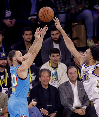 وأمطر كوري، الذي لعب في معقل فريقه جولدن ستيت ووريرز، ملعب تشايس سنتر، سلة فريق “تيم تشاك” على اسم النجم السابق تشارلز باركلي بسلسلة ثلاثيات متأخرة ليحسم فريقه الفوز (41-25).