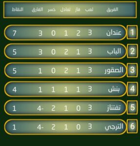 ومع اختتام منافسات الجولة الثالثة التي لم تحمل أي مفاجآت تذكر، استمر صراع القمة السداسي بينهم، دون جديد يُذكر، سوى مواظبة الفرق على طعم الانتصار، والاستقرار على فارق النقطة الوحيدة لصالحها، ويتصدّر عندان الترتيب بـ(7) نقاط، يليه الباب وصقور الفرات بـ(5) نقاط، لكل منهما.