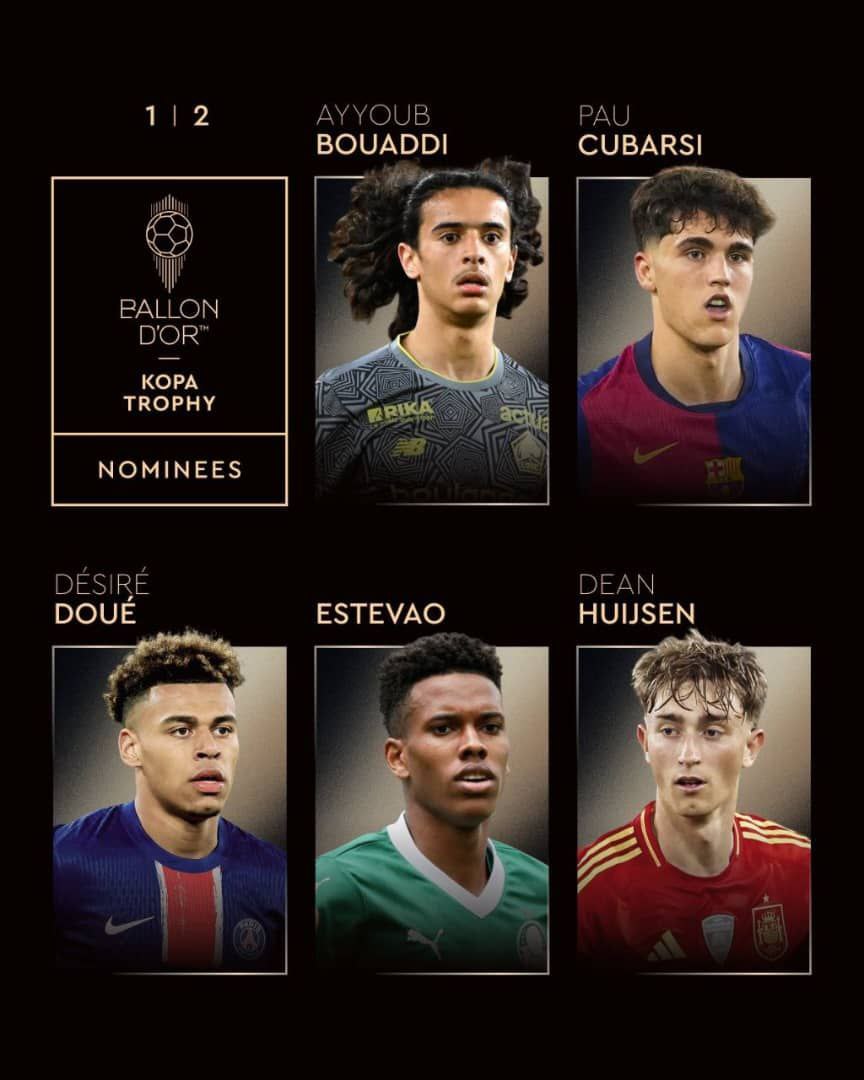وضمت قائمة جائزة “كوبا” لاعبين بارزين، مثل موهبة برشلونة، لامين يامال، بالإضافة إلى زميله بالفريق باو كوبارسي، كما ضمت القائمة التركي كينان يلدز لاعب جوفنتوس، والفرنسي أيوب بوعدي لاعب ليل، والفرنسي الآخر، ديزيري دوي نجم باريس سان جيرمان، كما ضمت القائمة كلاً من: البرازيلي إيستيفاو (تشيلسي) الإسباني دين هويسين (ريال مدريد) الإنكليزي مايلز لويس سكيلي (أرسنال) البرتغاليين رودريغو مورا (بورتو) وجواو نيفيز (باريس سان جيرمان).