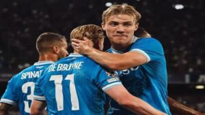 فيما حقق نابولي الإيطالي، فوزاً مثيراً على سبورتينغ لشبونة البرتغالي بنتيجة (2-1) ضمن ذات الجولة ، في مباراة شهدت تقلبات مثيرة حتى الدقائق الأخيرة، سجل المهاجم الدنماركي راسموس هويلوند، هدف السبق لنابولي عند الدقيقة (36) ليعود سبورتينغ لشبونة ويسجل هدف التعادل في الدقيقة (62) عبر ركلة جزاء نفذها لويس سواريز بنجاح، لكن نابولي لم يرض بالتعادل في الدقيقة (80) عاد هويلوند ليوقع على هدفه الشخصي الثاني وهدف الفوز لفريقه، ليعطي فريقه ثلاثة نقاط مهمة، ليبقى نابولي في المُنافسة داخل المجموعة، برصيد (3) نقاط في المركز (19) وسبوتينغ لشبونة (3) نقاط في المركز (14).