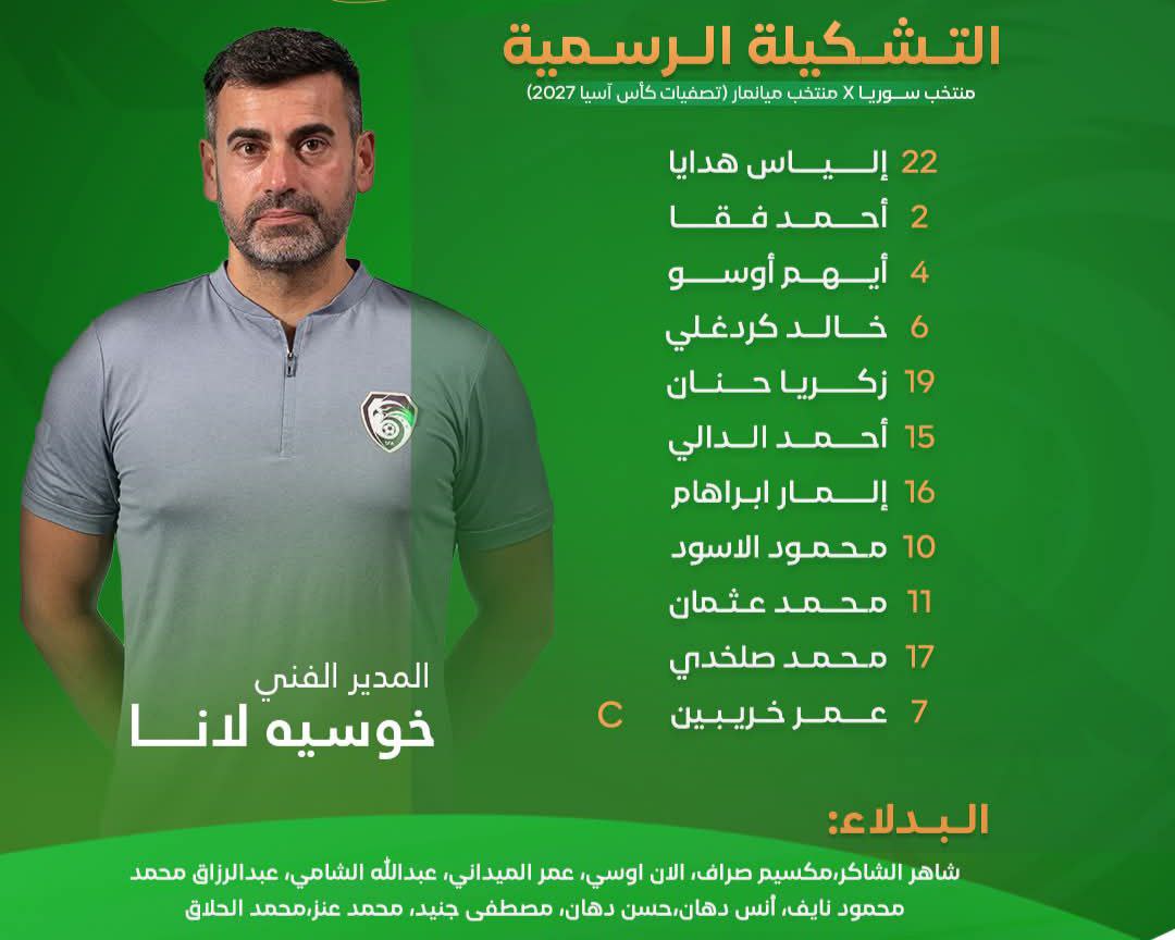 أعلن مدرب منتخبنا الوطني الأول الإسباني خوسيه لانا قبل قليل تشكيلة منتخبنا لخوض المباراة الحاسمة أمام منتخب ميانمار على صدارة المجموعة الخامسة ضمن الجولة الثالثة من تصفيات كأس آسيا-السعودية (2027)، تبدأ المباراة في تمام السابعة والربع مساءً بتوقيت دمشق وستكون منقولة على قناة “السعودية الرياضية 2”.