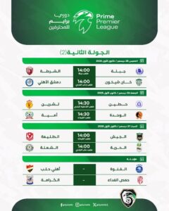 أصدر الاتحاد السوري لكرة القدم جدول مباريات الجولة الثانية من دوري برايم للمحترفين، المقررة يوم الخميس 25 كانون الأول 2025، مع تسجيل تغييرات مهمة تمثلت في تأجيل مباراتين تخص ناديي الكرامة وأهلي حلب.