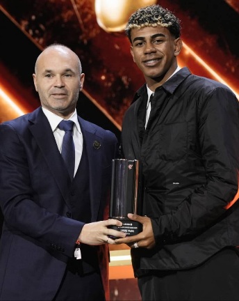 وتسلم يامال الجائزة من أسطورة برشلونة أندريس إنييستا.