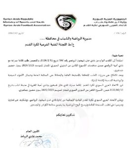 وأكد الاتحاد في كتابه الموجه إلى إدارة النادي أن الطلب جاء استناداً إلى المصلحة العامة، مشيداً بالمبادرة الإيجابية من إدارة خان شيخون وتعاونهم في الحفاظ على الروح الرياضية وسلامة الجميع.