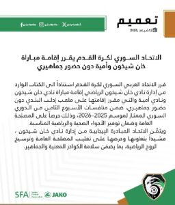 وجاء القرار استجابةً لطلب تقدمت به إدارة نادي خان شيخون، نصّ على إقامة المباراة دون جماهير حفاظاً على السلامة العامة وضمان أجواء صحية ورياضية مناسبة.