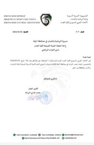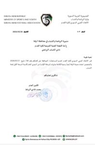 حيث وجّهَ مجلس إدارة الاتحاد خطاباً رسمياً للناديين لإخطارهما بالموافقة، وقد حصلت “الموقف الرياضي” على نسخة من الكتابين الموجهين؛ حيث نصَّ الكتاب الأول الخاص بـ نادي الفرات الرياضي على موافقة قسم المسابقات باعتماد ملعب الفرات في محافظة الرقة لإقامة مباريات الدوري العام لأندية الدرجة الممتازة (فئة الشباب) كبديل عن محافظة دير الزور.