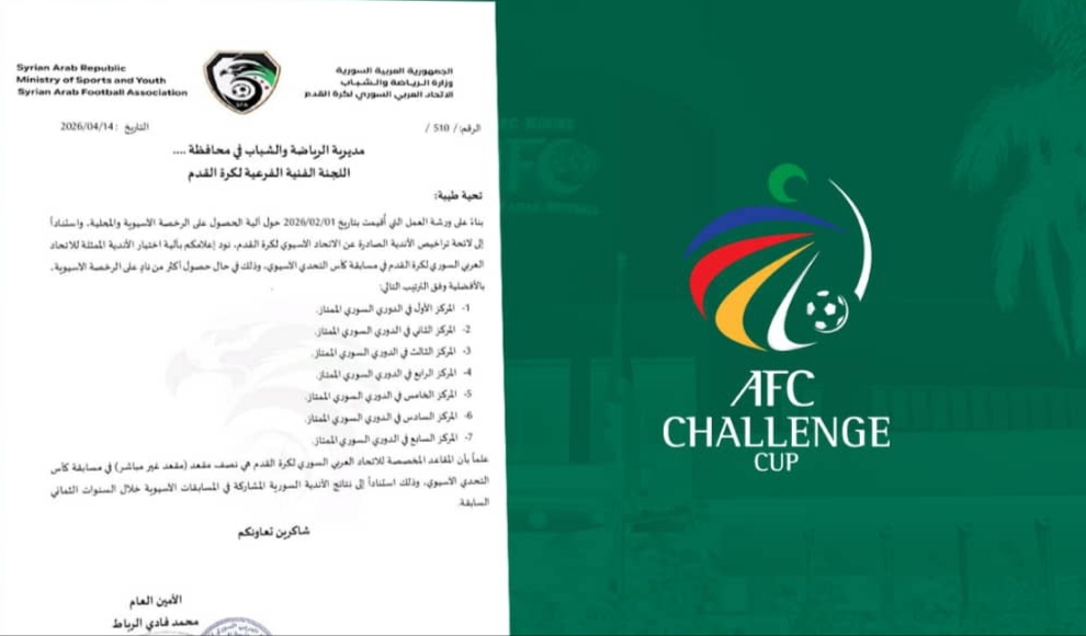 “بناءً على ورشة العمل التي أقيمت بتاريخ 1 شباط 2026 حول آلية الحصول على الرخصتين الآسيوية والمحلية، واستناداً إلى لائحة تراخيص الأندية الصادرة عن الاتحاد الآسيوي لكرة القدم، نود إعلامكم بآلية اختيار الأندية الممثلة للاتحاد العربي السوري في مسابقة كأس التحدي الآسيوي، وذلك وفق الأفضلية والترتيب التالي:”