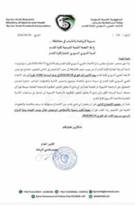 وبحسب كتاب رسمي حصلت “الموقف الرياضي” على نسخة منه، دعا الاتحاد رؤساء أندية الممتاز أو من ينوب عنهم، إضافة إلى مديري التراخيص في الأندية، لحضور اجتماع يعقد يوم الاثنين 20 نيسان في مقر الاتحاد بدمشق، لمناقشة آلية استكمال متطلبات التراخيص والخطوات اللازمة للحصول عليها.