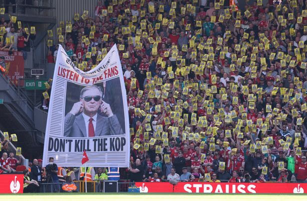 ودوى هتاف “أيها الجشعون كفى” في كافة أرجاء ملعب آنفيلد معقل ليفربول، تزامناً مع رفع البطاقات في جميع جوانب المدرجات الأربعة.