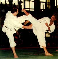 من مدارس دفاعيه أخرى وقد أراد أوياما أخذ المفيد من الأساليب الأخرى والمفاهيم الأفضل ويدخلها تدريجياً في تدريبه وبناء على ذلك وضع حجر الأساس لمدرسة كاراتيه كيوكو شنكاي وتعني الكلمة ( الحقيقة المطلقة أو النهائية) تشبه إلى حد كبير كاراتية شوتوكان لأنها انشقت منها من حيث اللباس، ونظام التدريب يتكون من (كيهون ـ أساسيات) (كاتا ـ قتال مع أشخاص وهميين وهي ضرورية للتركيز والتنفس والحفاظ على مستوى اللاعب) ( الكوميتيه ـ القتال)وهي تختلف عن الشوتوكان في حركات الكاتا ونظام المباريات حيث يوجد فيها نظام الضربة القاضية أو الانسحاب وكيفية تسديد اللكمات باليد وترتيب الأحزمة وأسماء الكاتا كما يوجد فيها نظام عروض تكسير الأخشاب وألواح الثلج لإثبات قوة اللاعب ويتجلى جمال اللعبة بأنها تجمع بين معظم الألعاب الدفاعية في العالم وقد أخذت من كل فن حركاته القوية والذكية وأدمجتها وطورتها لكي لا يتشتت اللاعب بين أنظمة الألعاب الأخرى كما أنه في المباريات يطلق على اللاعب لقب مقاتل لقوة اللعبة وبدأ انتشارها حول الكرة الأرضية وأصبحت من أكبر المنظمات للفنون الدفاعية في العالم بعد الشوتوكان وهي الآن لعبة تم ضمها لمكتب الفنون الدفاعية كما يؤكد السيد بسام رمضان حامل الحزام الاسود في هذه الرياضة من المنظمة الدولية للكاراتيه كيو كو كشن والذي يتمنى أن يزدهر هذا المكتب لتطوير الألعاب التي ضمها ويكون قادرا على اختيار كوادره لا أن يتراجع إلى الوراء بسبب البعض الغير قادر على التطور وعدم الإلمام ببعض هذه الرياضيات والتي سنتحدث عنها في الأعداد القادمة .